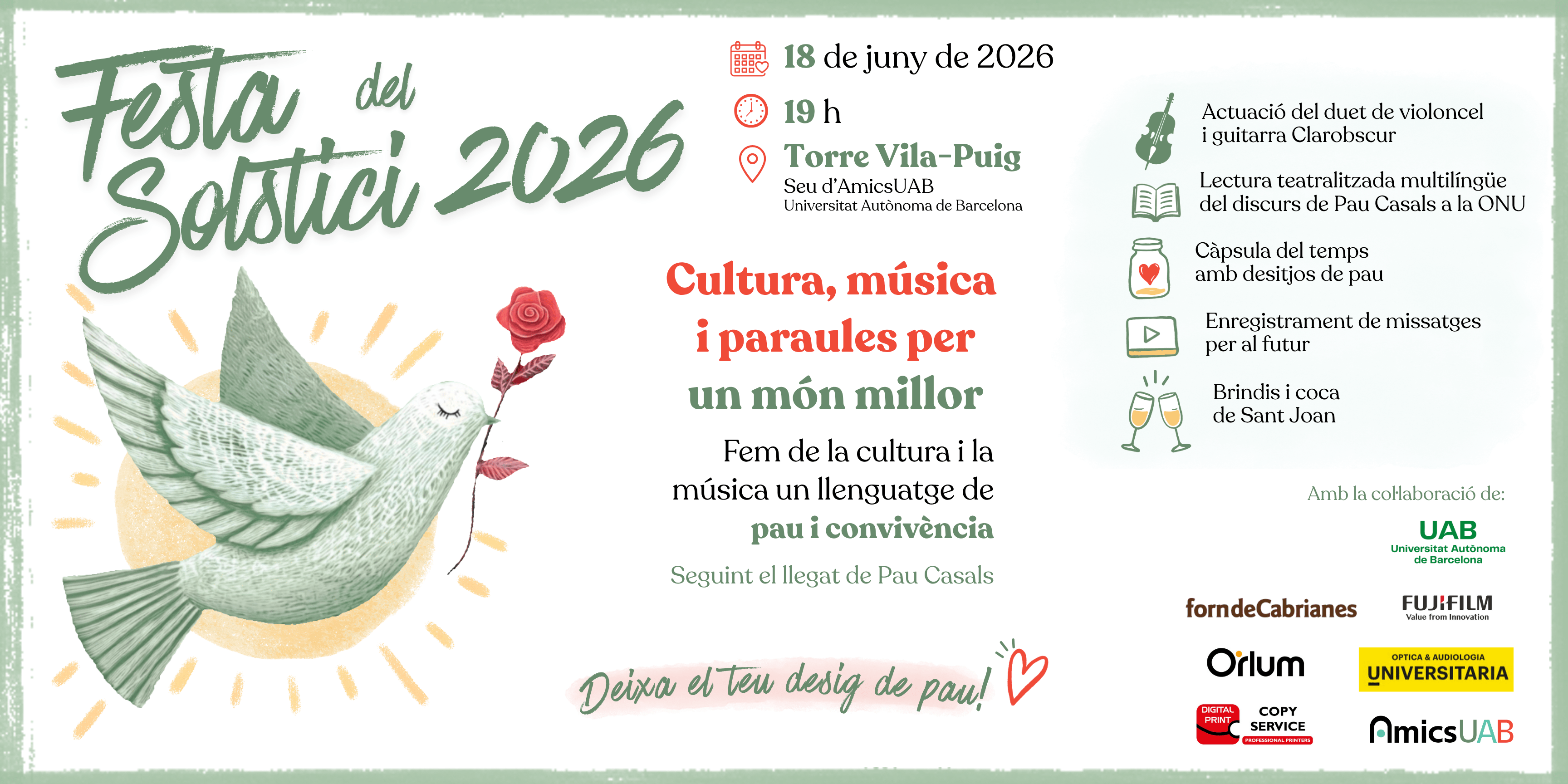 La vetllada inclourà diverses activitats que conviden a la reflexió i a la participació col·lectiva: una actuació del duet de violoncel i guitarra Clarobscur, una lectura teatralitzada i multilingüe del discurs de Pau Casals a les Nacions Unides, així com la creació d’una càpsula del temps amb desitjos de pau i l’enregistrament de missatges audiovisuals per al futur.