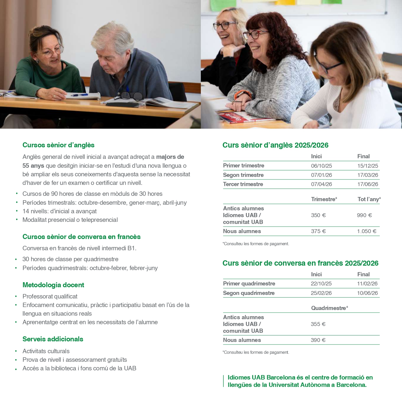 Són cursos de 90 hores dividits en mòduls trimestrals de 30 hores cadascun (dos dies de classe setmanals), que es poden cursar en modalitat presencial o en línia. Podeu consultar tota la informació dels cursos d’anglès sènior a la seva web.